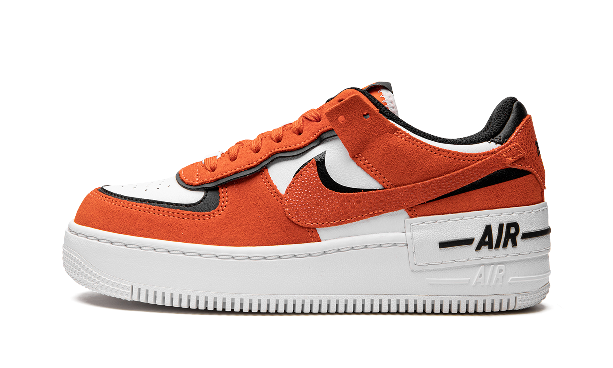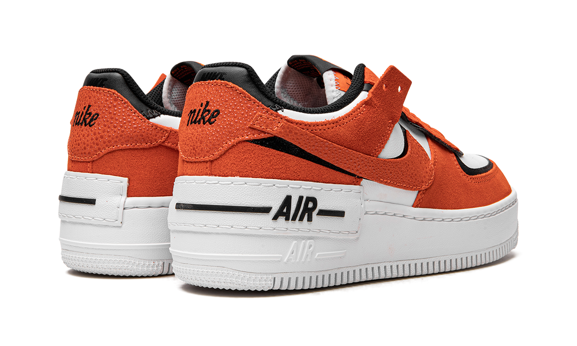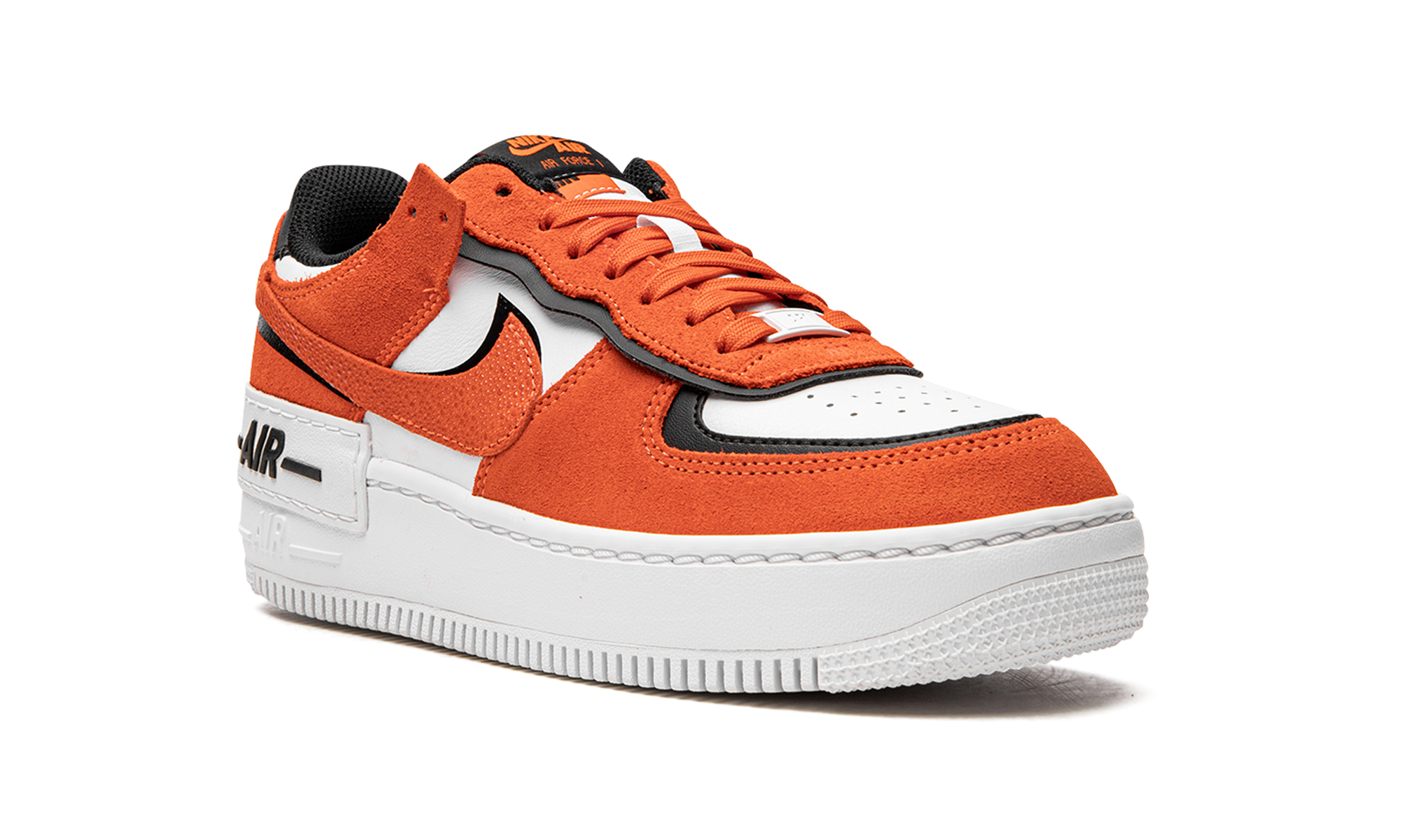 The Women’s Nike Air Force 1 Shadow “Rush Orange” is a women’s-exclusive colorway of the boldly modified AF1 design. With its layered overlays and other contemporary design elements, the Air Force 1 Shadow is unofficially inspired by Off-White’s collaborations with Nike. The “Rush Orange” features a deconstructed aesthetic that was made popular by Abloh, Off-White, and Nike, and even nods to the avant-garde look of Sacai and Nike’s “double” aesthetic. The upper is constructed with a white leather base with orange suede layered over black leather panels. A Rush Orange-colored suede Swoosh is placed on top of a black leather Swoosh on the sides of the shoe. A white rubber panel with black “Air” branding is found above the tonal “Air” logo on the white rubber midsole.