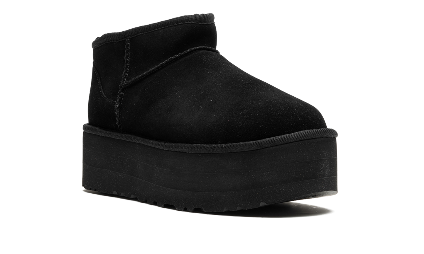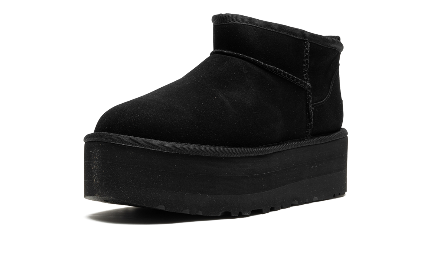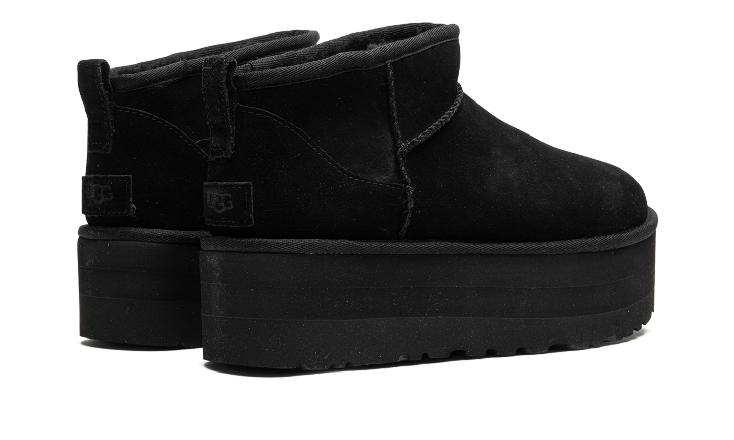 Step into luxurious height with the UGG Classic Ultra Mini Platform Wmns "Black". This women's boot features a fashionable platform sole and a sleek, black suede upper. The plush sheepskin lining ensures supreme warmth and comfort, making it a perfect choice for stylishly running errands or cozy indoor wear.